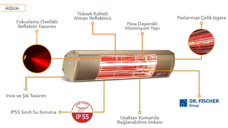 Ayrıca IP55 su ve toz koruma standartlarına göre test edilmiş ve sertifikalandırılmıştır. Bu nedenle ısıtıcılar açık alanlarda gönül rahatlığı ile kullanılabilir.